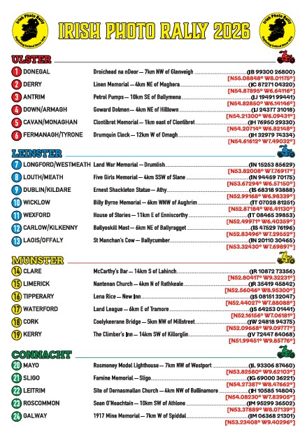 Disclaimer: It is the responsibility of each rider to determine for themselves whether it is safe to visit the designated points. Due to varying factors such as the weather, the suitability of the motorcycle, the ability of a rider etc., Irish Photo Rally and its organisers cannot be held responsible for the safety and security of participants.